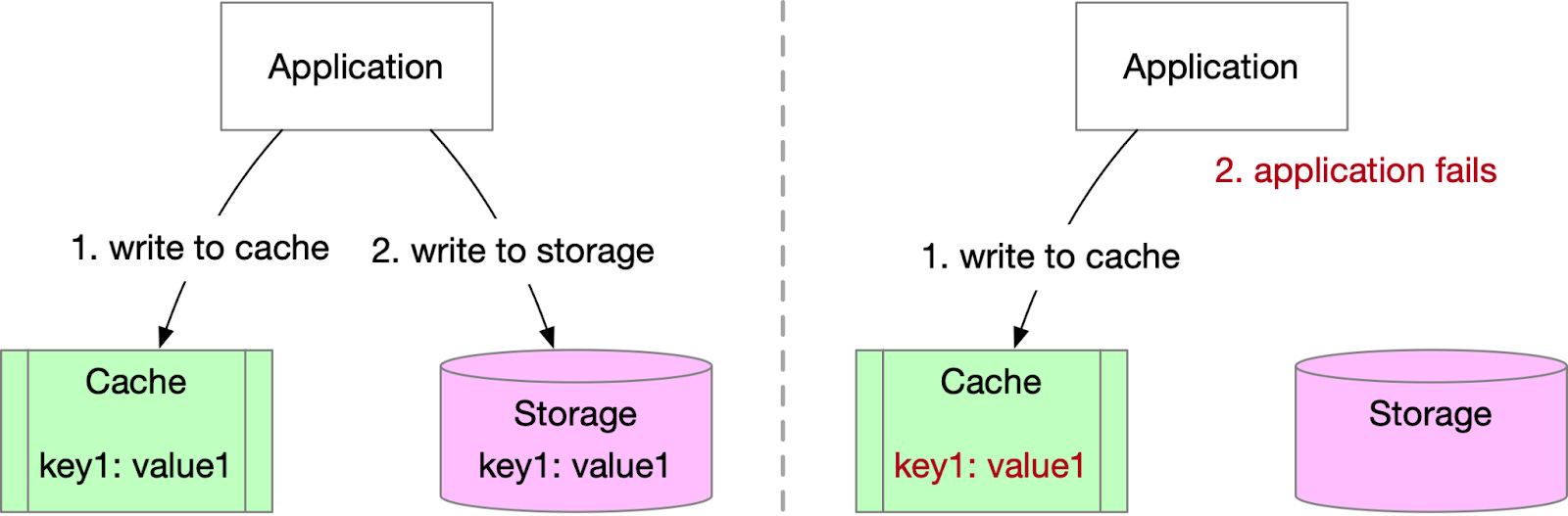 Writing to the cache first, then to storage: As illustrated below, data is written to the cache before storage. If the application fails before writing to storage, the cache will contain extra data not present in the durable storage. This situation can negatively affect system behavior, as the extra cached data should not be visible.