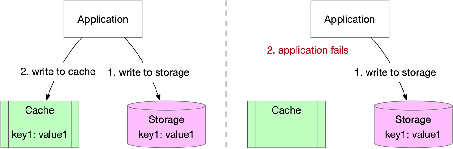 Writing to storage first, then to the cache: As shown below, data is written to storage before the cache. If the application fails before writing to the cache, no harm is done if the cache does not contain the key. However, if the key was already cached, the cached value becomes stale.