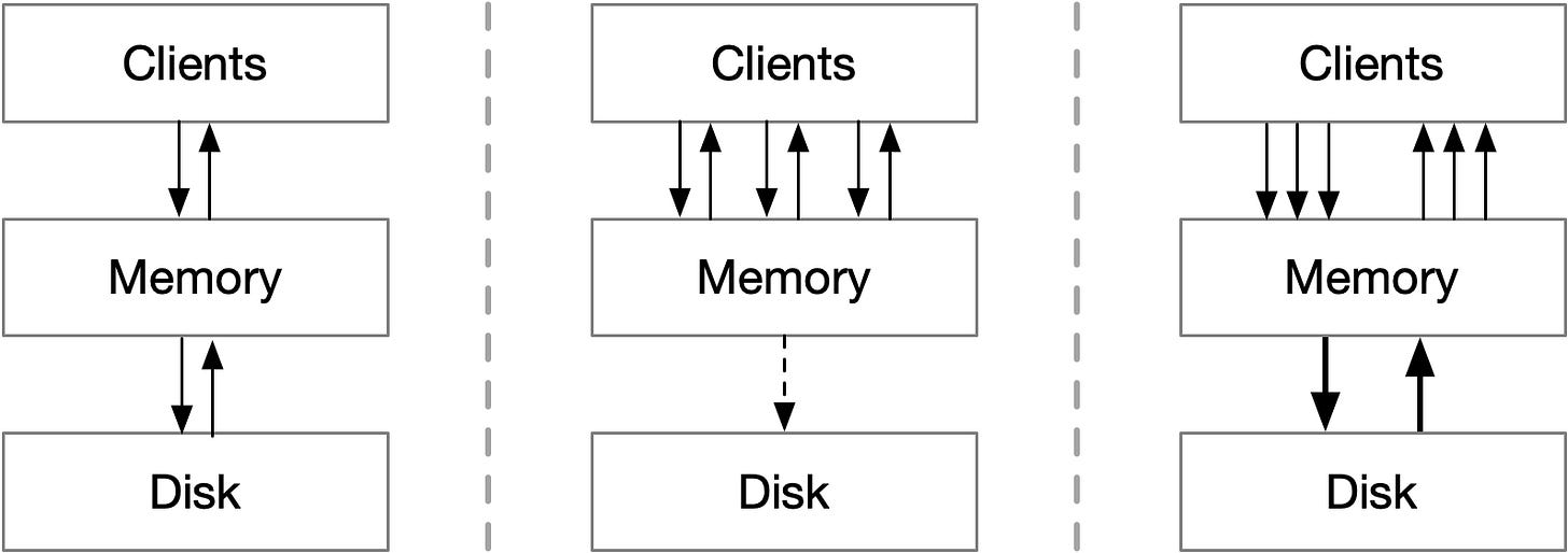 Write-back strategy: This method updates the disk asynchronously in batches after the memory is updated. While it generally offers better performance since caching systems prioritize speed, the write-back cache acknowledges write requests before writing to the disk, which may cause data loss if a crash occurs during this process.
