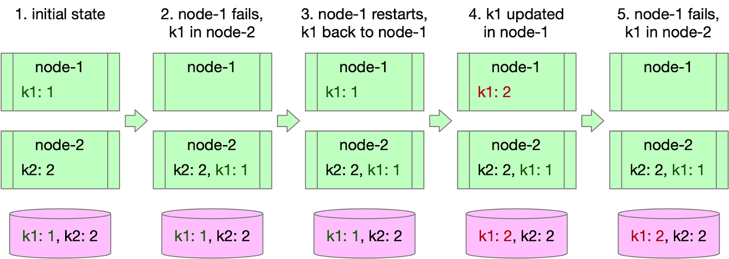 Node-1 restarts, and k1 is rehashed back to node-1, but k1's value in node-2 remains.