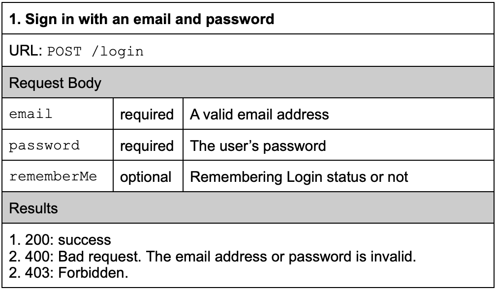 Once we have registered on the website, we can log in using the email and password. We list the API in the table below: