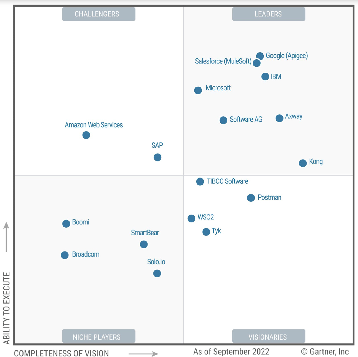 Last September, Gartner released their Magic Quadrant for Full Life Cycle API Management [4], highlighting key players like Apigee and MuleSoft as leaders and Postman as a visionary. Have a look at the detailed diagram below.