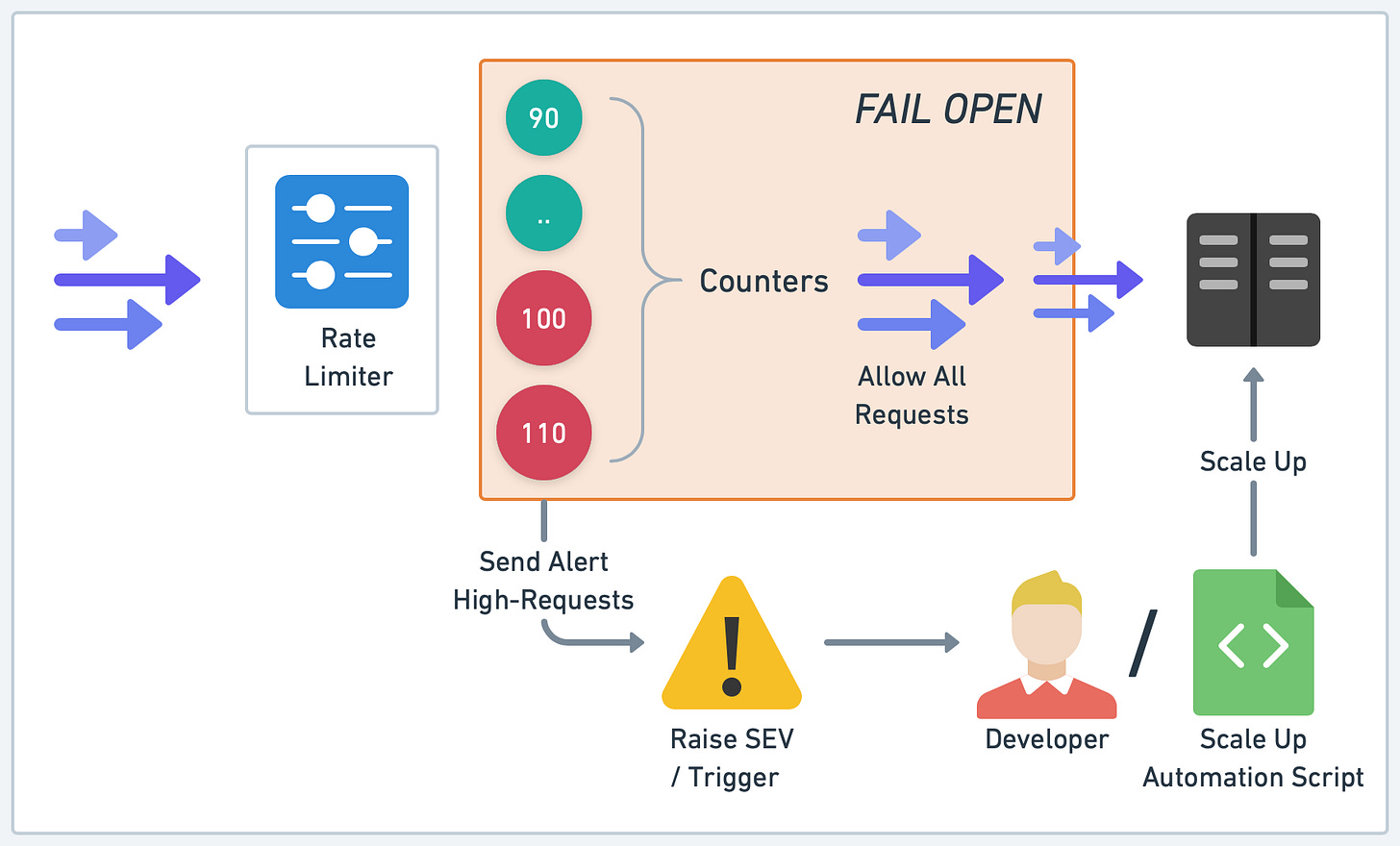 Even with the most robust rate limiters, we can't entirely avoid failures. We incorporate strategies to manage them gracefully to minimize their impact on the system and the end-user experience.