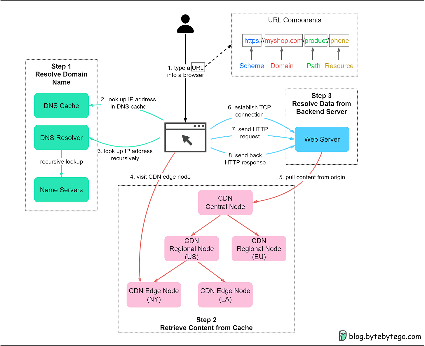 Step 1: A user enters the URL https://myshop.com/product/iphone into a browser. A typical URL has four parts: