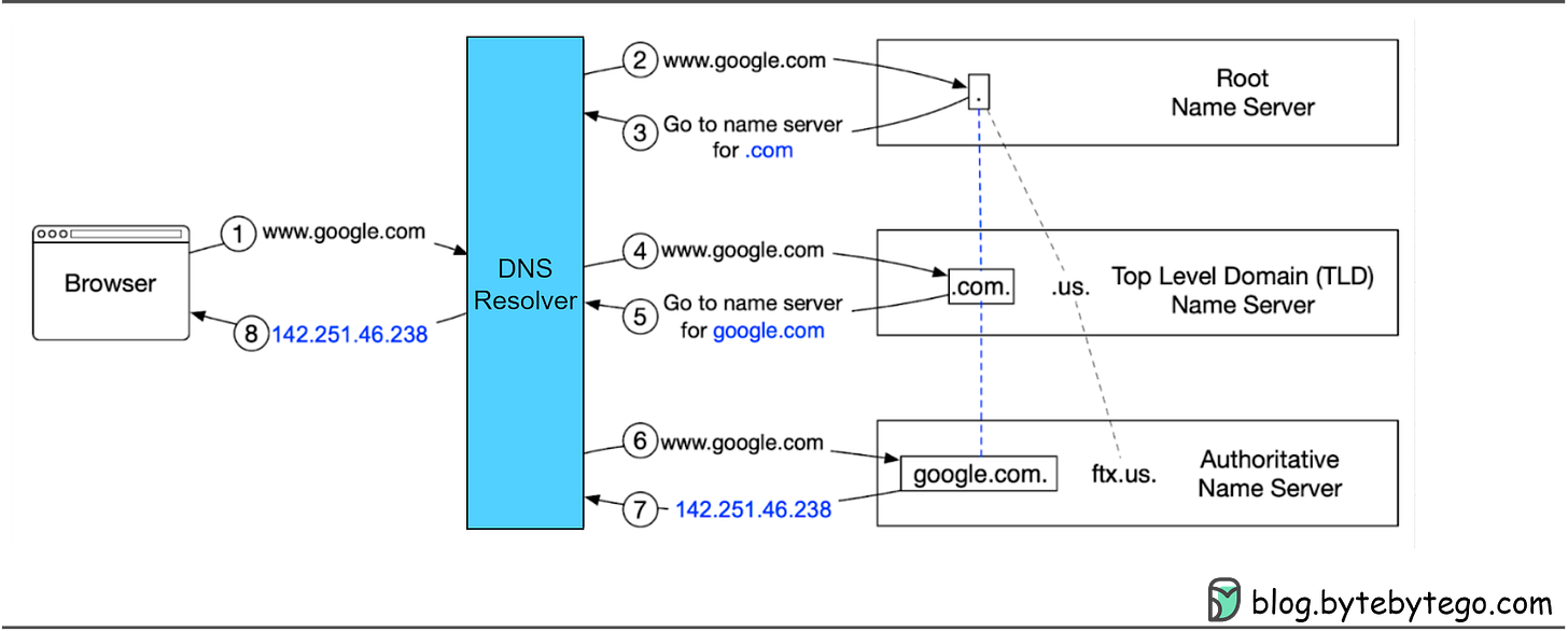 Step 3: If the IP address is not cached, the browser asks the DNS resolver to recursively resolve the domain name via a hierarchy of name servers. More on this later.