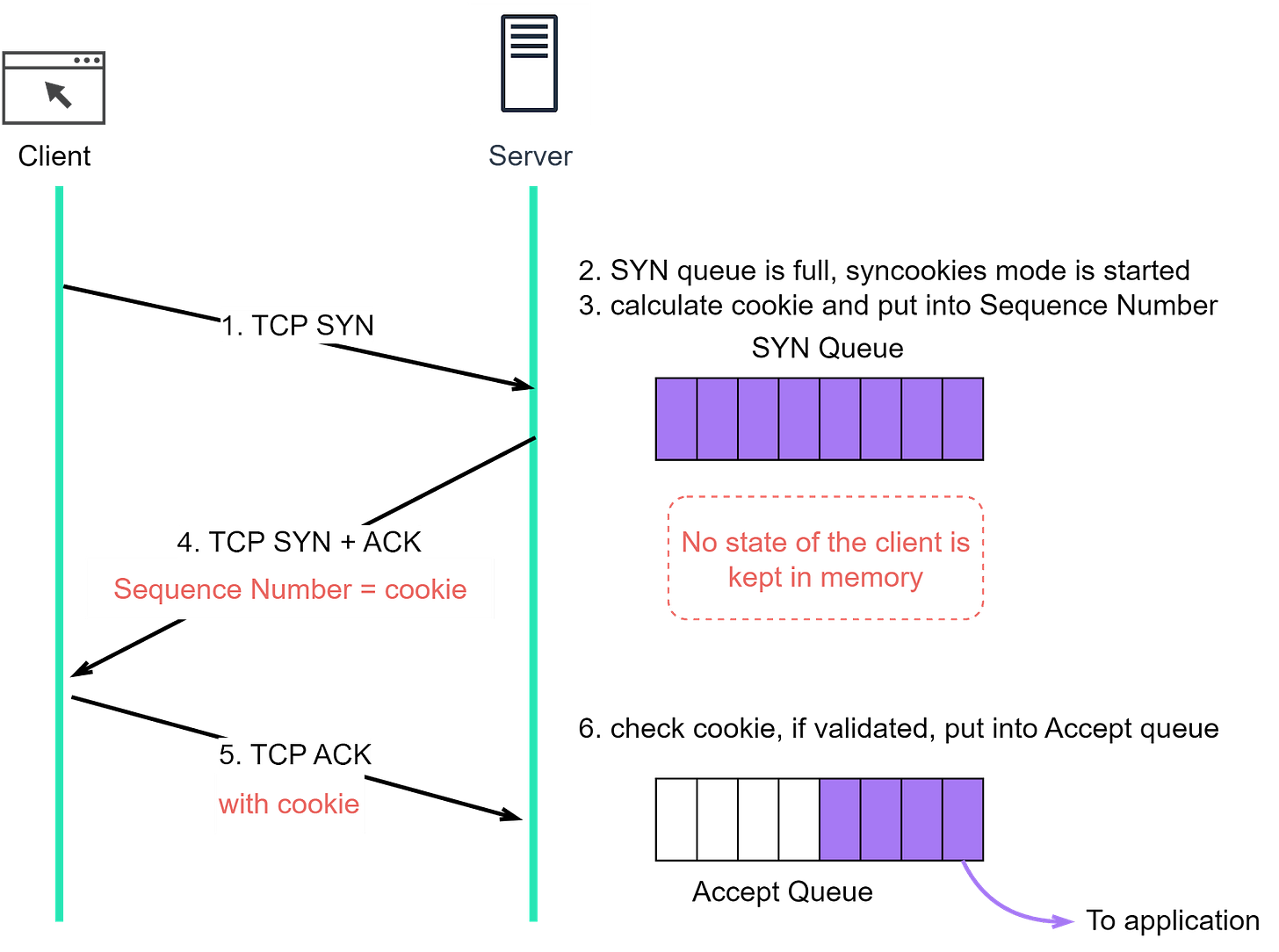 Step 6: When the server receives the ACK segment, it verifies the cookie. If the cookie is valid, it means the client has proven its legitimacy, and the server will then enqueue the connection into the accept queue. In this way, the connection can be established even when the SYN queue is full, thereby mitigating potential SYN flood attacks