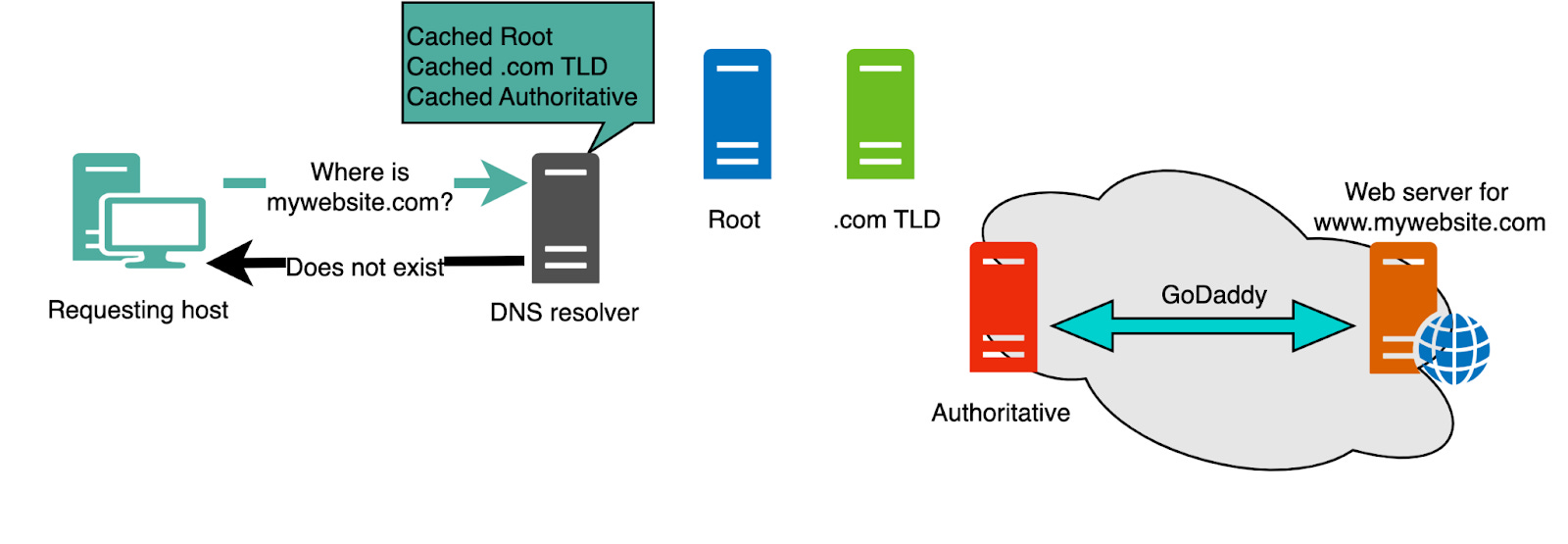 Suppose the requesting host is making a request to resolve the name bytebytego.com. Here’s how this is going to unfold:
