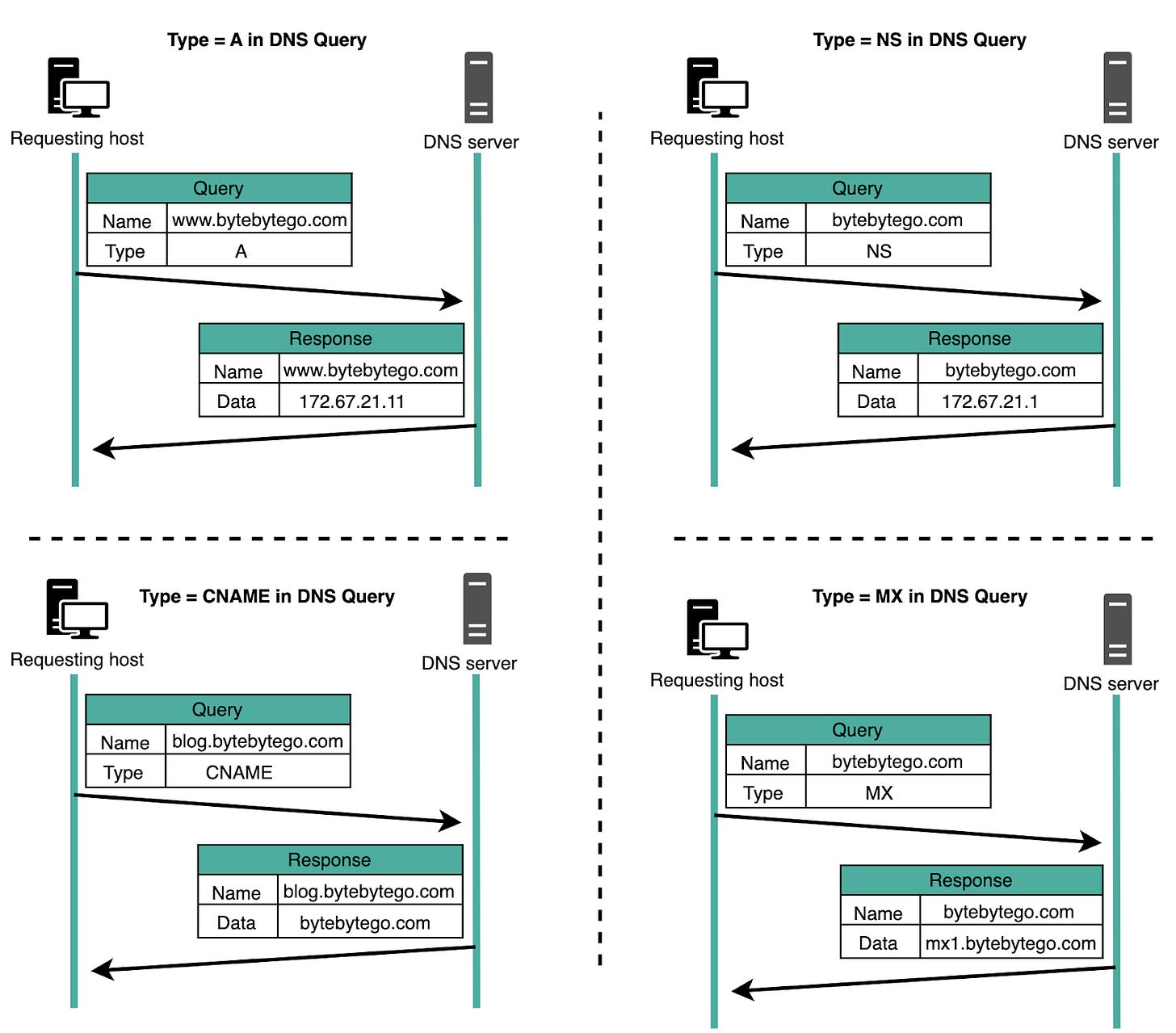 The below illustration shows these four types when used in a DNS query and their corresponding DNS responses.