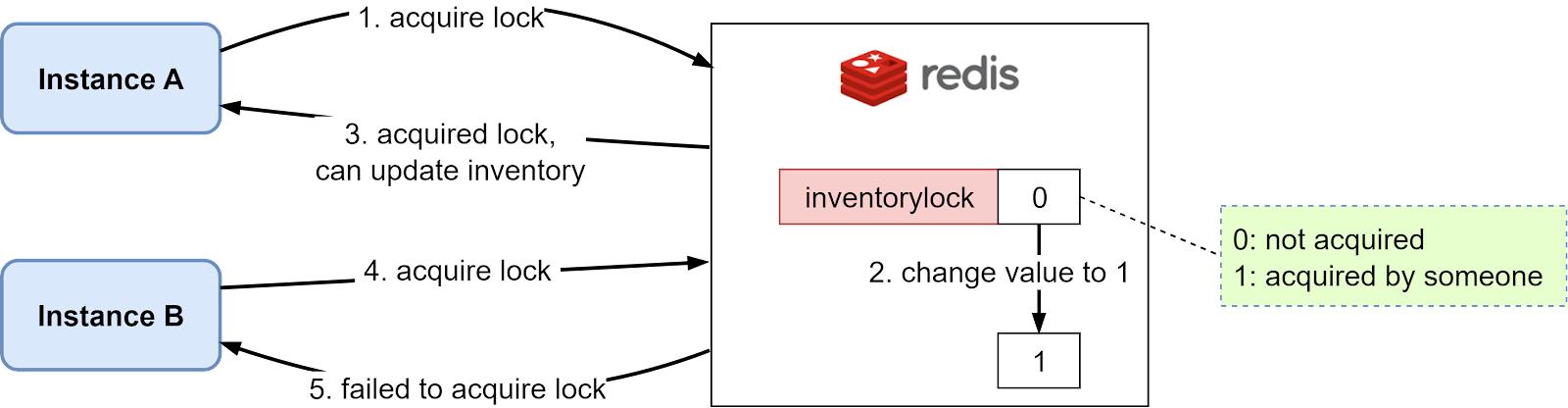When instance B then wants to update the inventory, the lock has already been set to 1 by instance A, so B’s request fails.