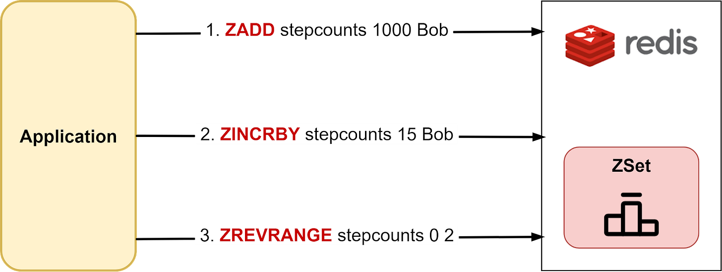 Let's look at how to build a real-time leaderboard for step counts using Redis ZSet commands: