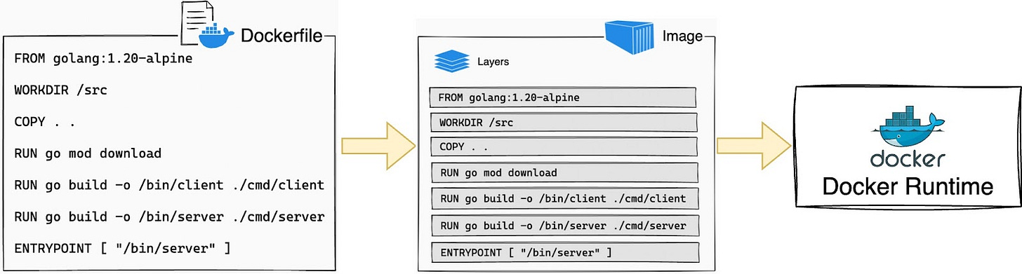 The Docker engine unpacks this image and starts a container process to run the application in an isolated namespace, like a sandboxed process on Linux.