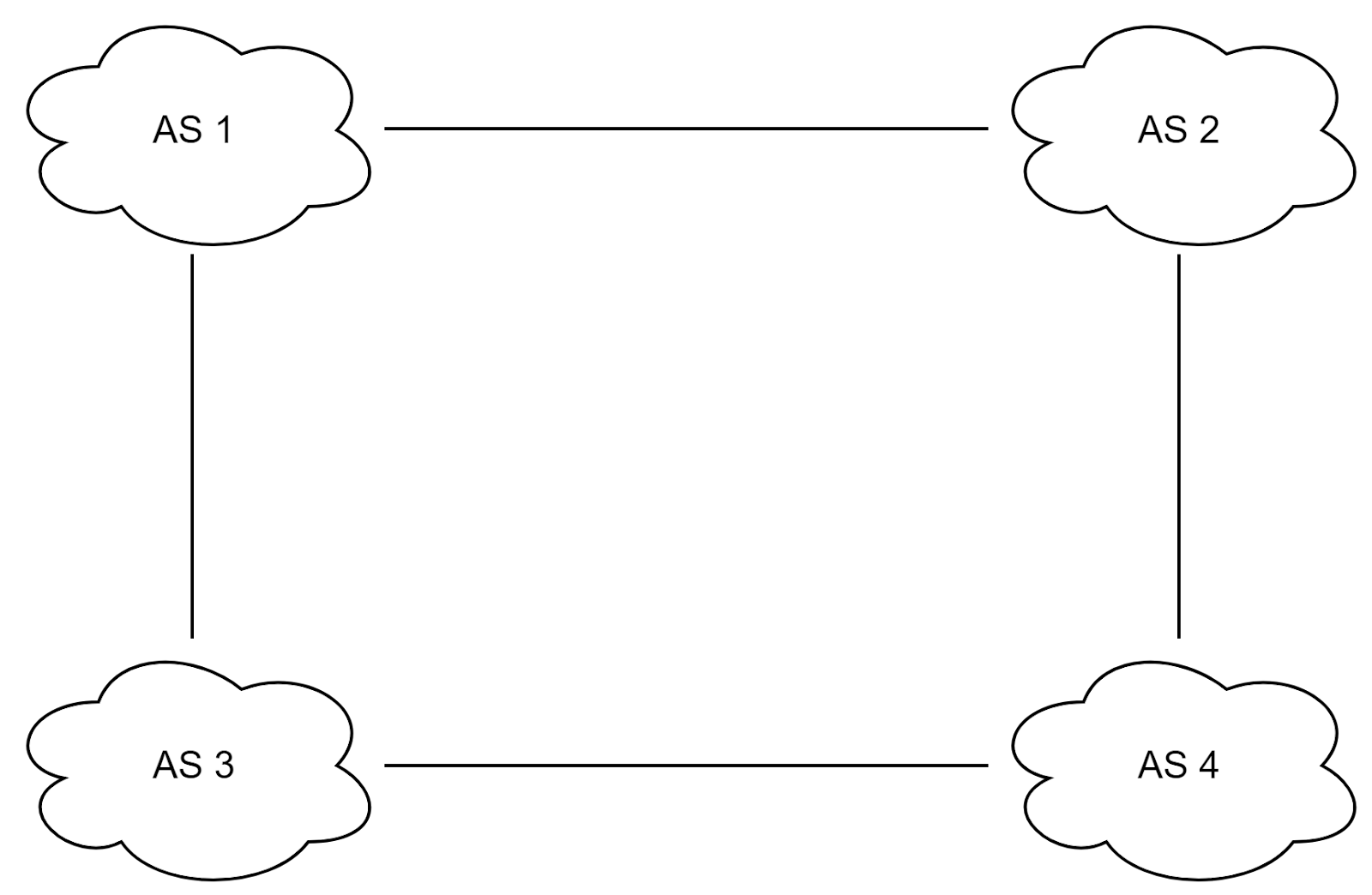 We have four autonomous systems here - AS1, AS2, AS3, and AS4. The internal routing inside each AS is the responsibility of the autonomous system itself. BGP handles routing between ASes.
