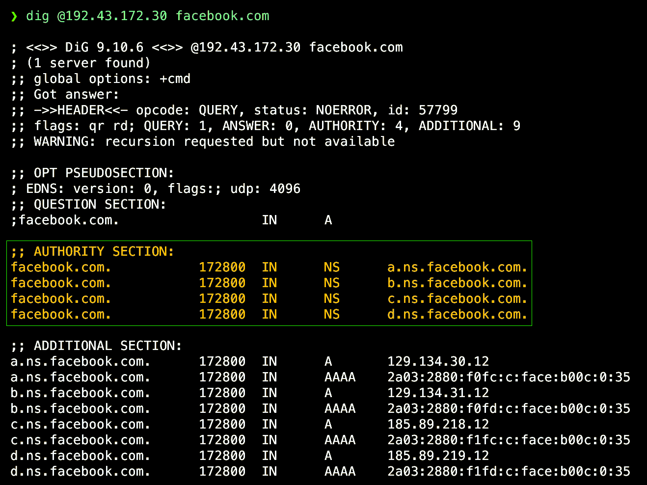 We’ll trace through what happened on that fateful day by simulating what must have happened from my computer to one of the authoritative name servers for Facebook: 129.134.30.12.