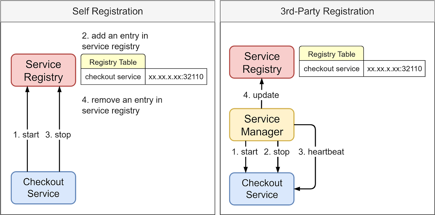 In self-registration, services report their status to the service registry, which then updates the registry table. In third-party registration, a service manager handles lifecycles of services by starting and stopping instances and updating the registry. The service manager also pings services to monitor service health.