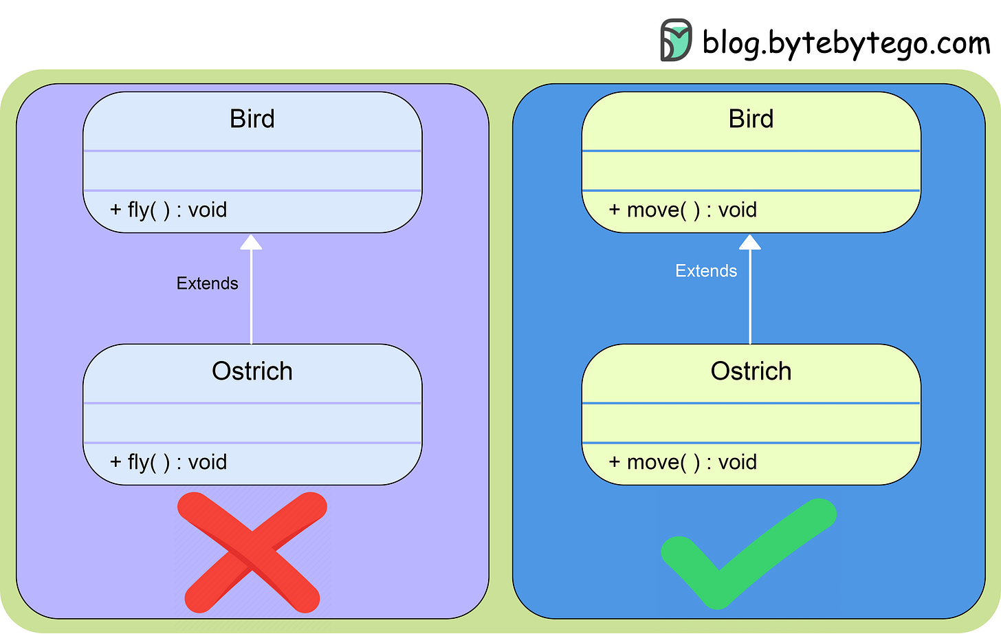 }In this revised example, the Ostrich class is a subtype of the Bird class, and it overrides the move method to provide a meaningful behavior that aligns with the LSP. An instance of Ostrich can be substituted for an instance of Bird without causing issues.