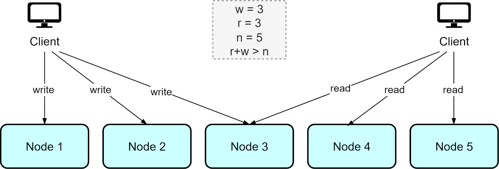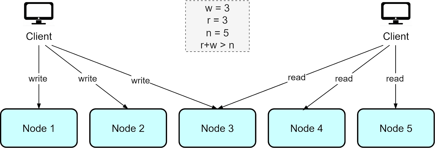 The Amazon Dynamo database uses a leaderless architecture where write requests are sent to multiple nodes (w) and read requests are also fanned out to multiple nodes (r). As long as the number of nodes written to and read from exceeds the total number of nodes, that is, r + w > n, this ensures the most up-to-date data can be read. This approach, based on quorums for reading and writing, allows maximum availability since there is no leader node