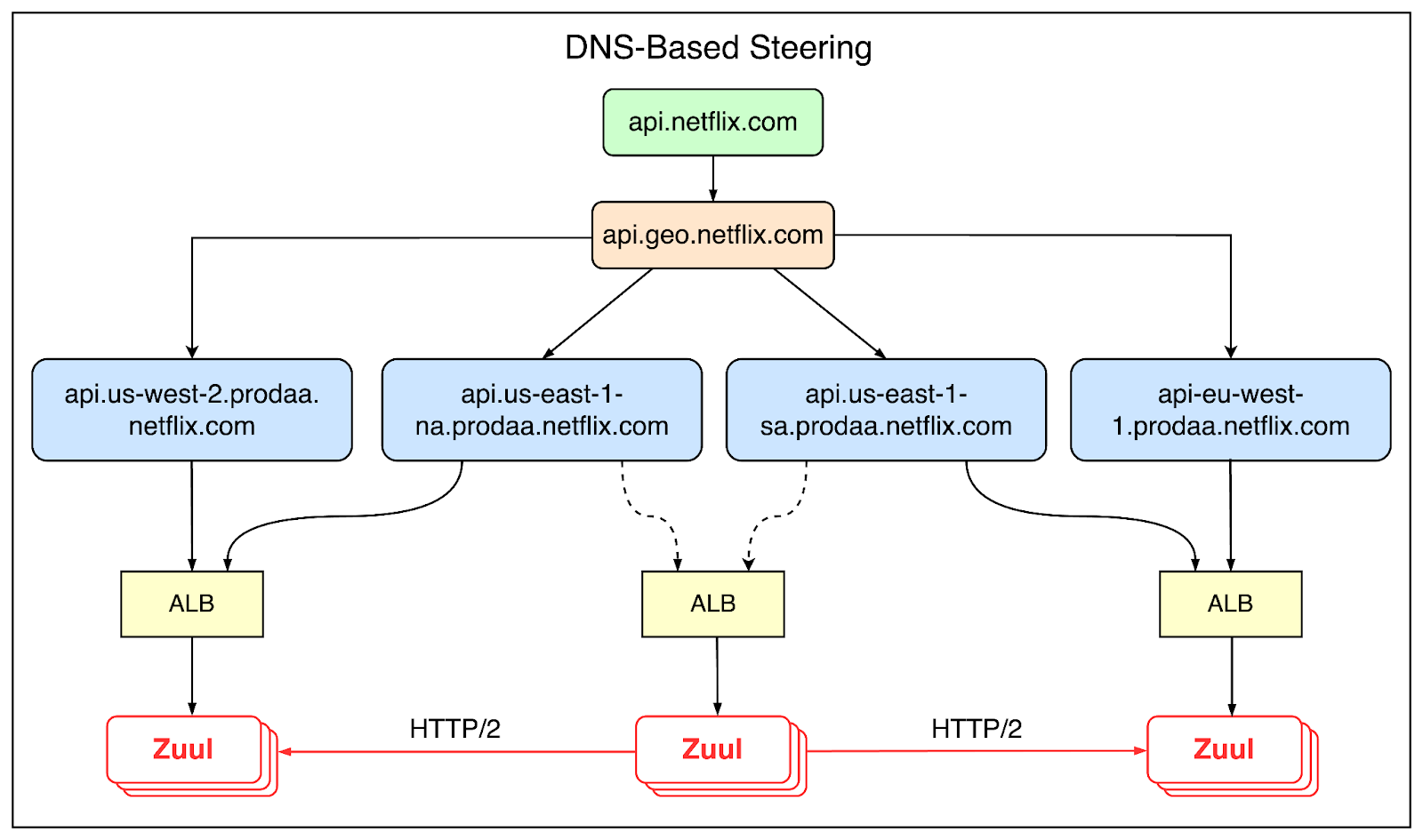 The load balancer terminated the TLS and sent plain traffic to the application. Also, the DNS configuration was quite simple. The idea was that clients should be able to find and reach the Netflix servers.