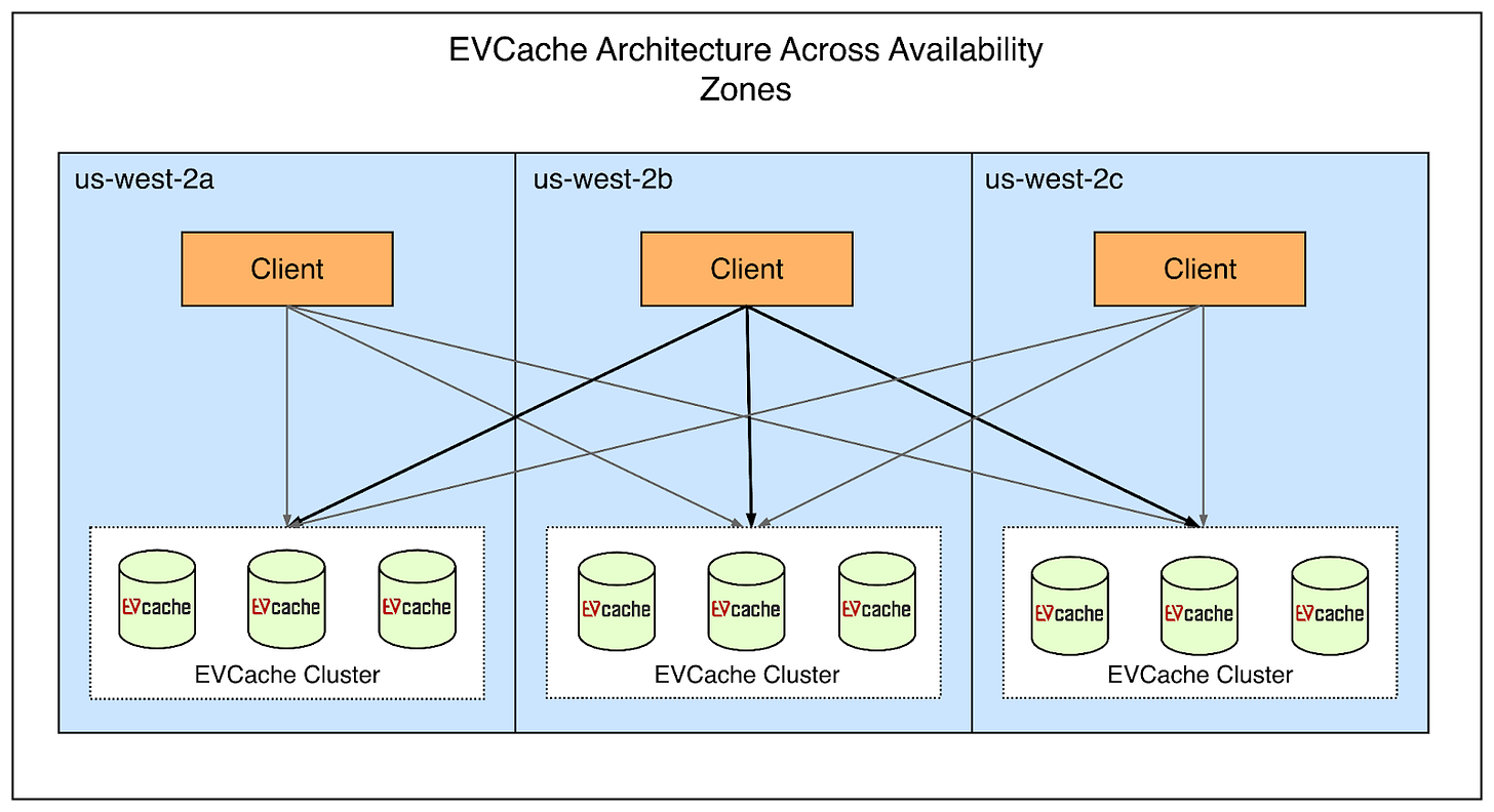To support scalability, EVCache is built to maintain 3 whole copies of data across different AWS availability zones. All clients are connected to all servers in a cluster across availability zones and regions. See the below diagram that shows this arrangement.
