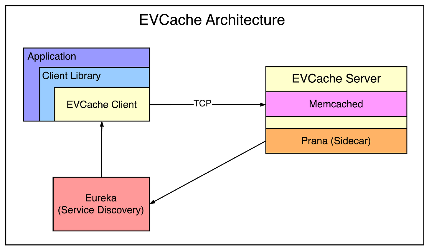 The EVCache Server is based on memcached. It also has a sidecar process known as Prana that allows non-Java services to use EvCache. Prana also lets EVCache hook into the Netflix infrastructure to report on metrics and connect to service discovery.