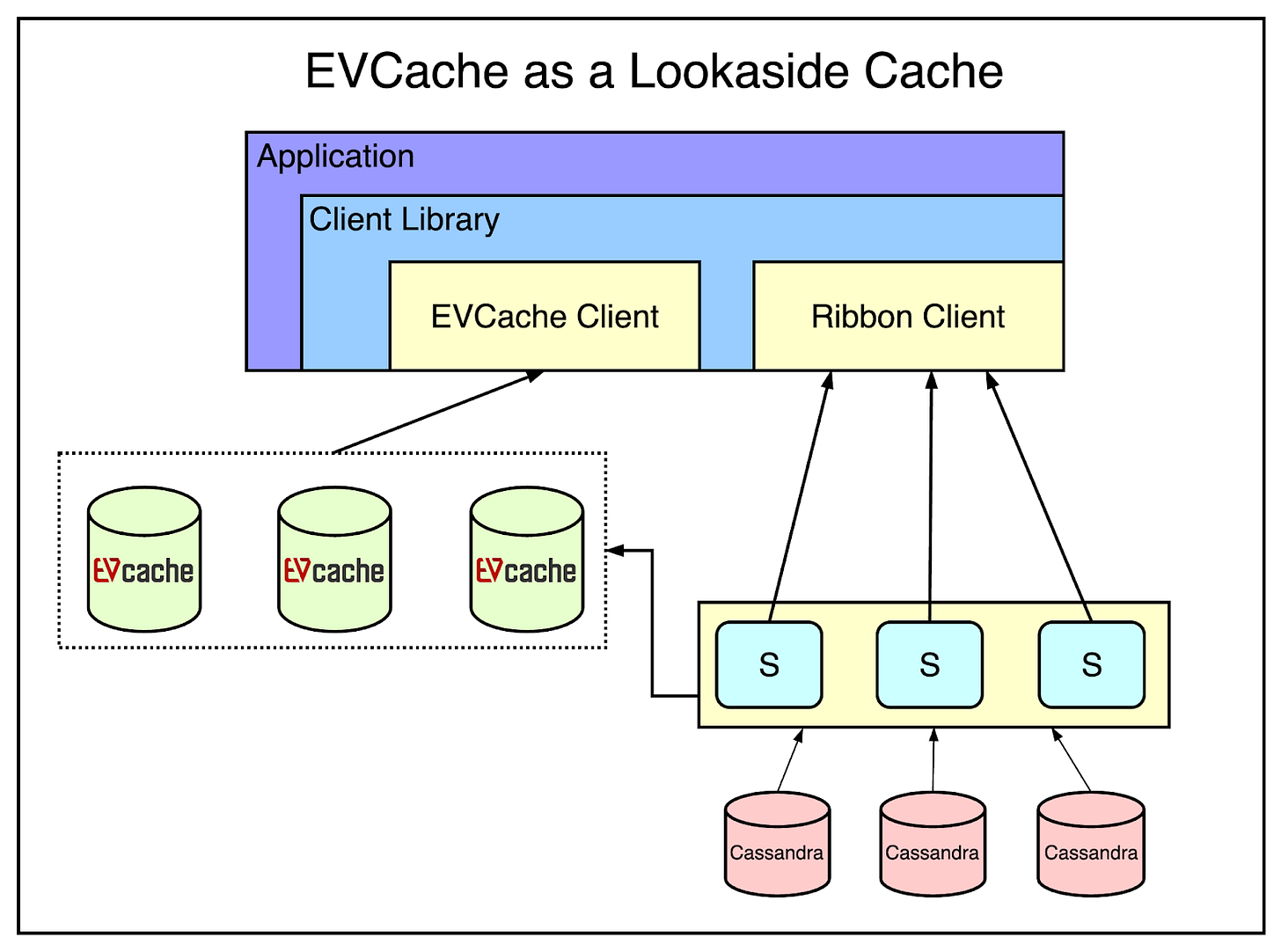 When the application requests some data, it first tries the EVCache client and if the data is not there, they go to the backend service and the Cassandra database to fetch the data.