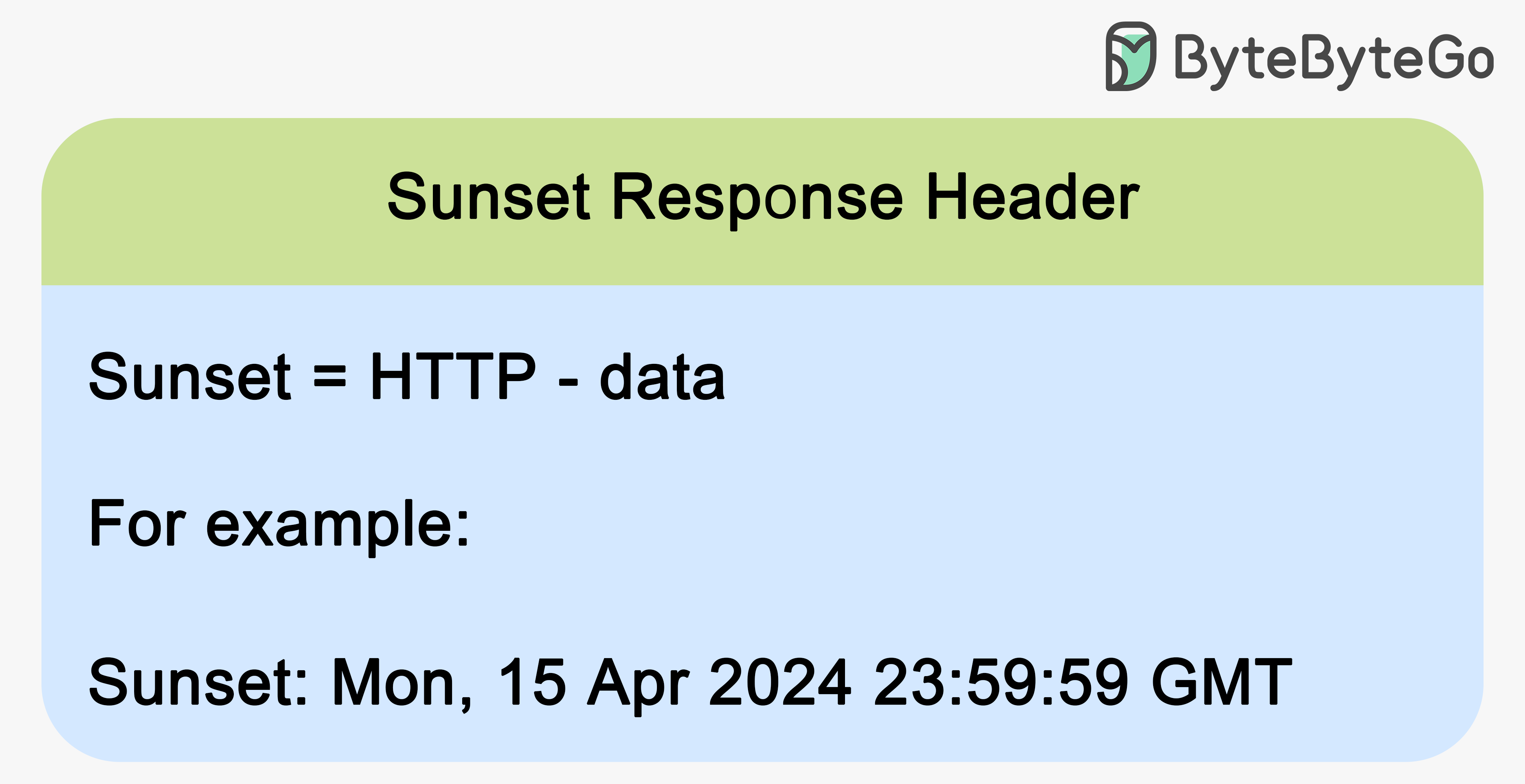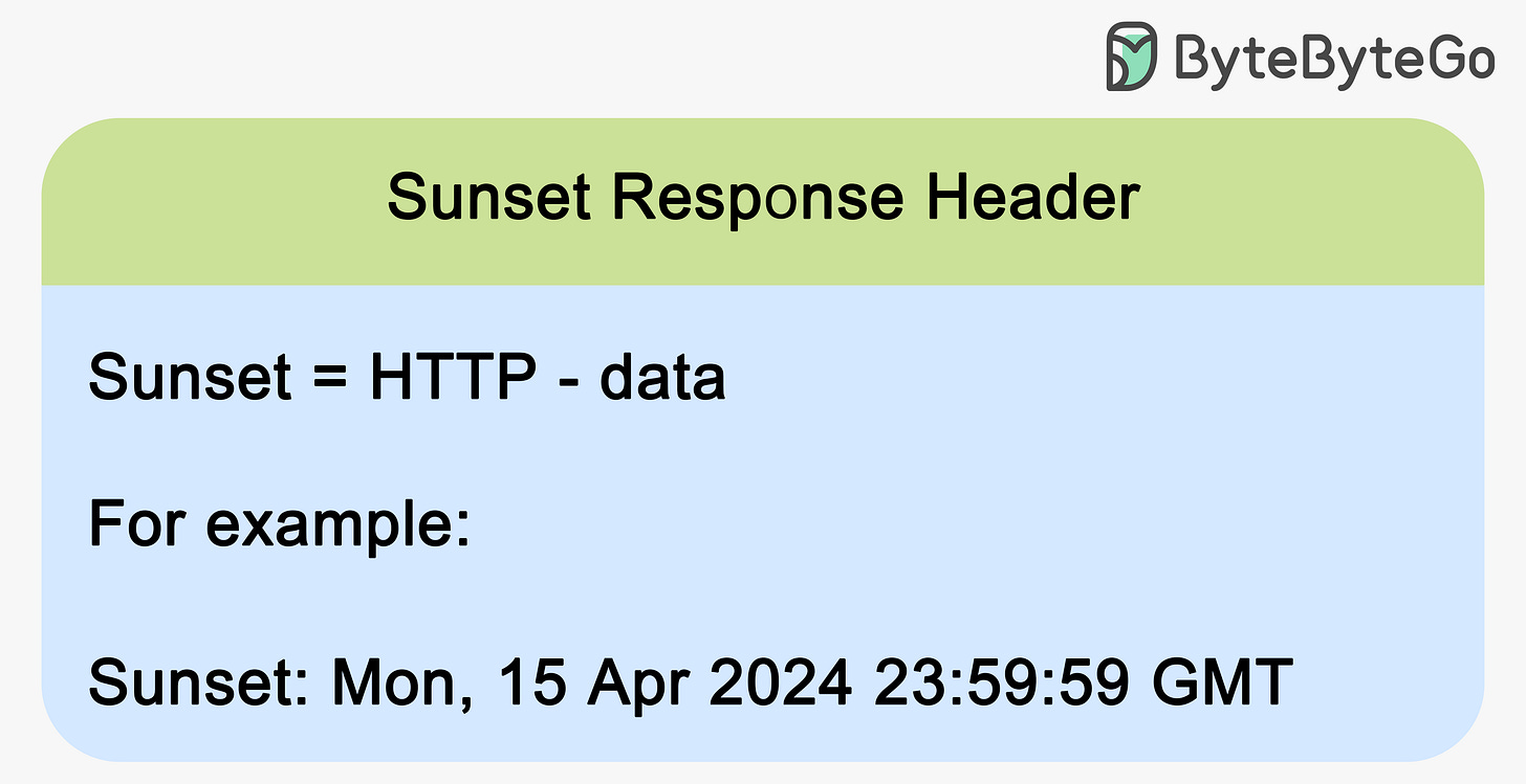 We can also use a Sunset header. This header is added to the response object and indicates that the resource is expected to become unavailable at a specific time. Consumers should treat these sunset timestamps as hints. Once the sunset time is reached, requesting that resource should result in either 400-level errors or 300-level redirections. The sunset header doesn't need to specify which type of error will occur once the resource is decommissioned.