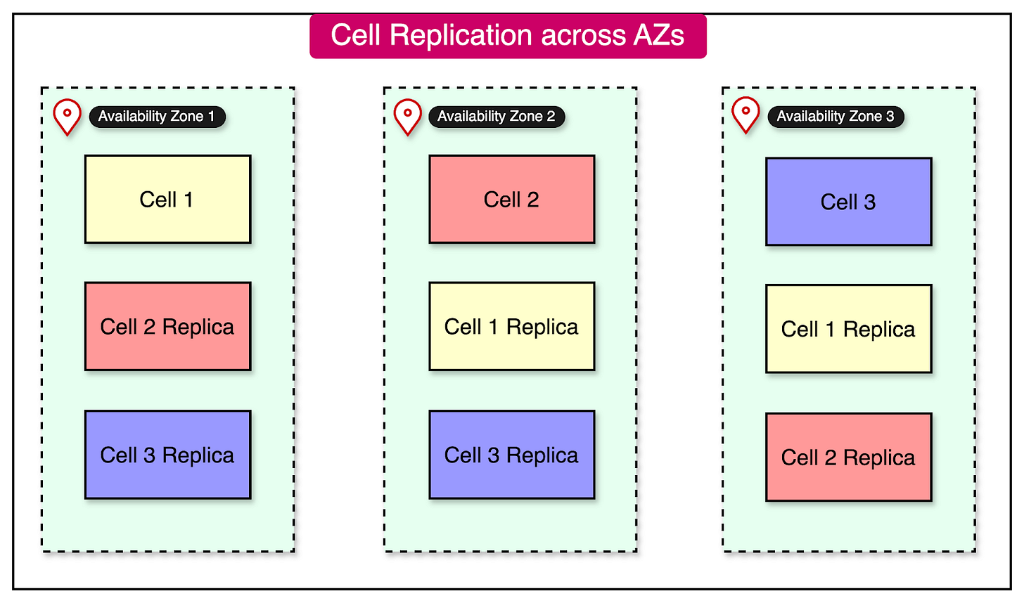 On the downside, the state of a cell has to be replicated across multiple cells in different availability zones. See the diagram below: