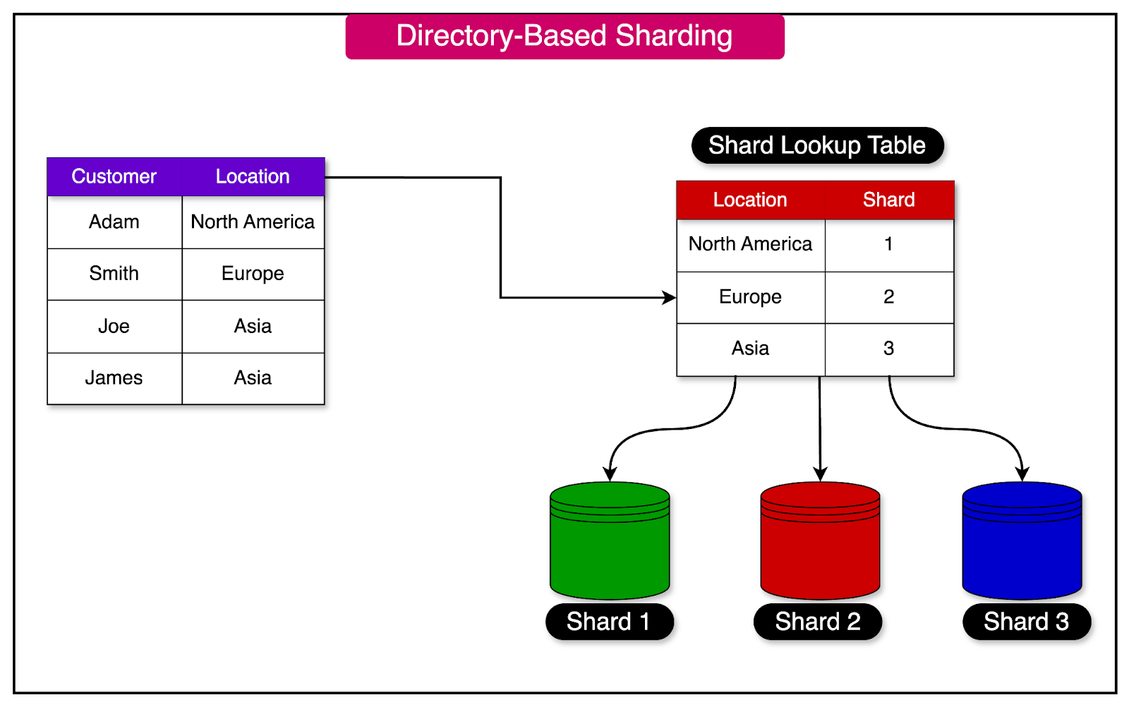 The diagram below illustrates the concept of directory-based sharding, using the "Location" field as the shard key: